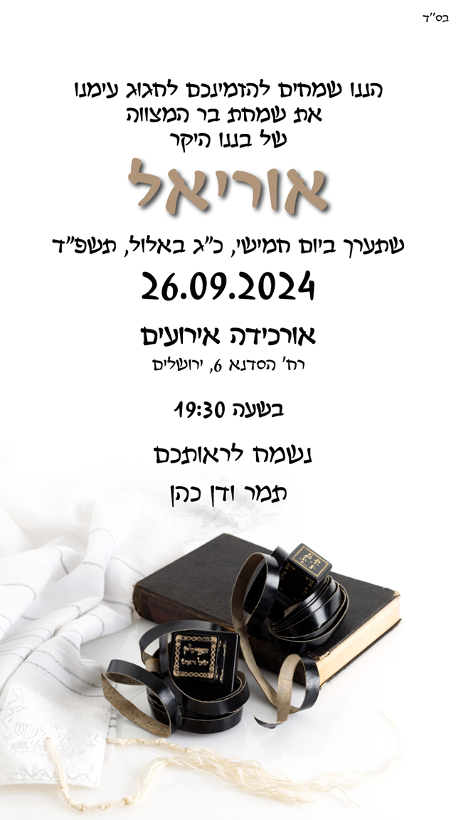ההזמנה הדיגיטלית תישלח אליכם תוך 24 שעות מרגע ההזמנה באתר, וברוב המקרים בתוך שעה, ישירות לוואטסאפ או למייל שלכם.