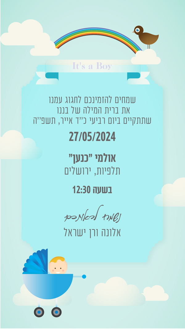 ההזמנה הדיגיטלית תישלח אליכם תוך 24 שעות מרגע ההזמנה באתר, וברוב המקרים בתוך שעה, ישירות לוואטסאפ או למייל שלכם.